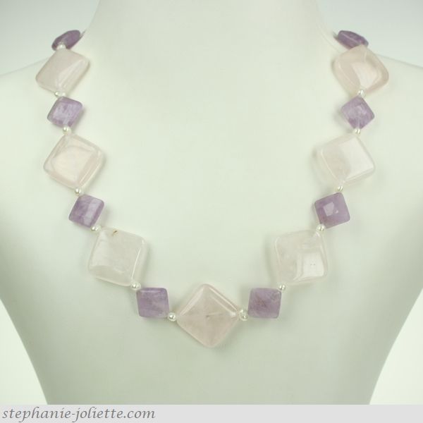 AMRO058-886KSI / Halskette (auf Edelstahldraht), Steine/Schliff (Amethyst: Zylinder 10x7 mm, Kugeln 8 mm; Rosenquarz: Kreisel 12x10 mm, Kugeln 10 mm), Verschluss (Federring aus 925er Sterlingsilber), Länge (50 cm) / 58.- €uro